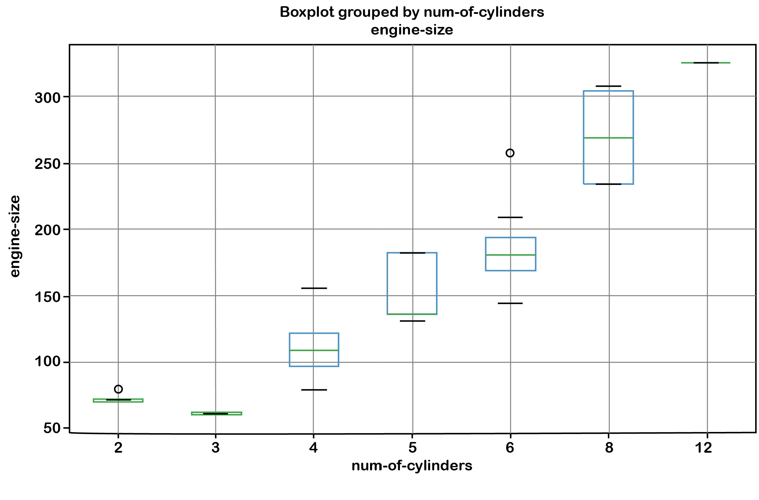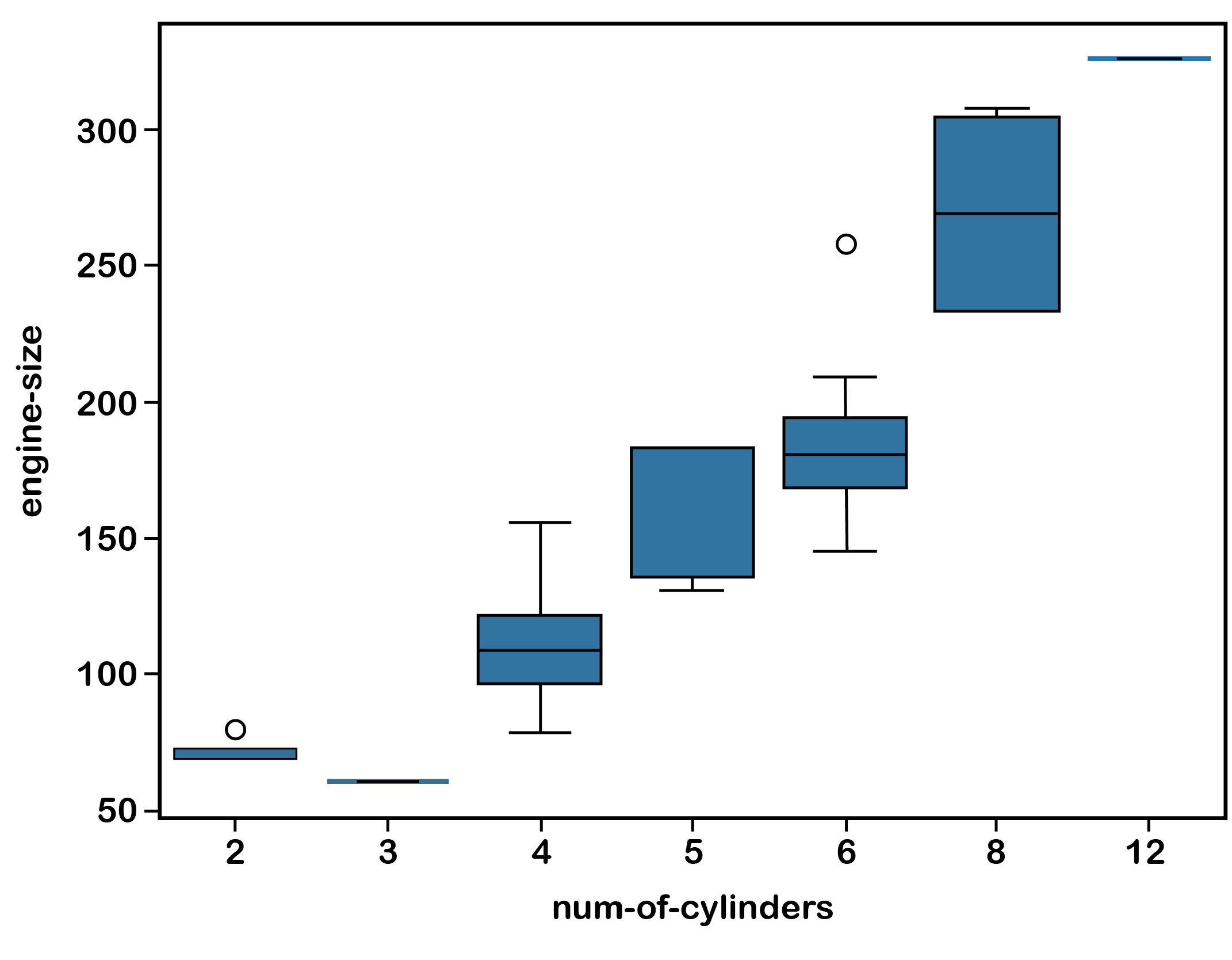 - create a boxplot for the variable "engine-size" with the x-axis as "number of cylinders":
