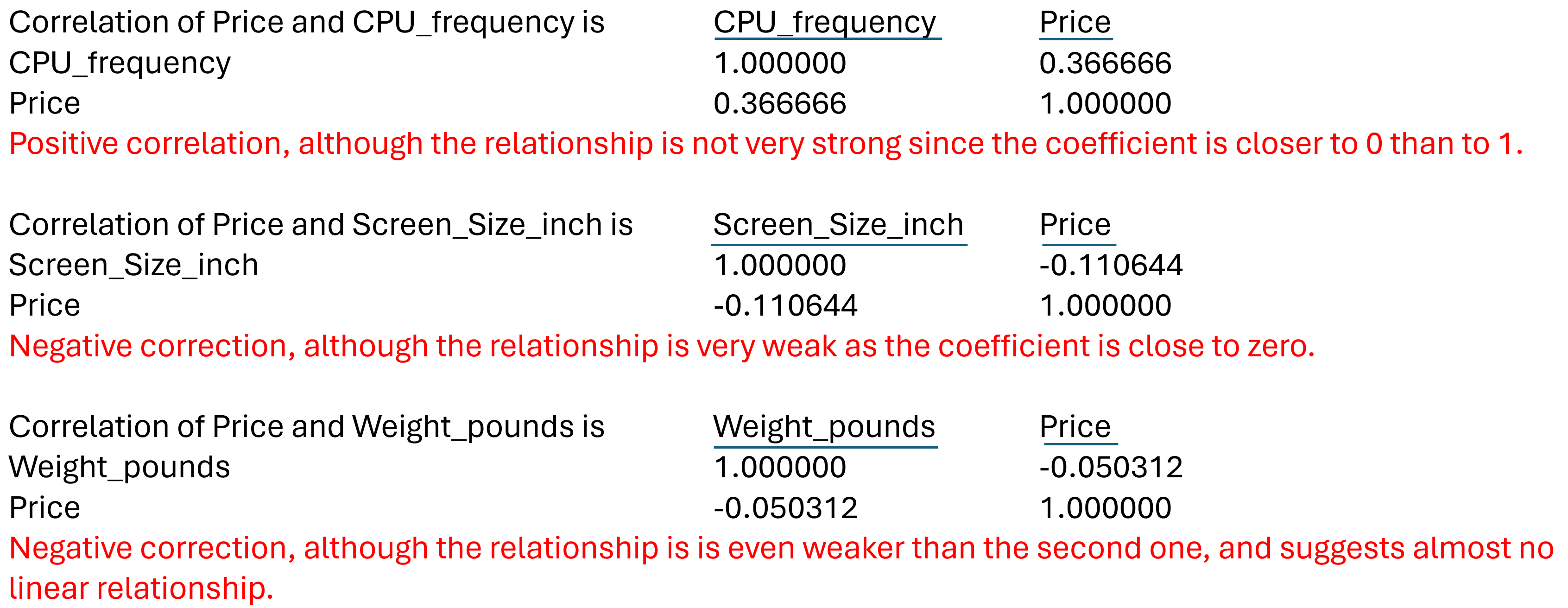 # Correlation values of CPU_frequency", "Screen_Size_inch" and "Weight_pounds" with Price