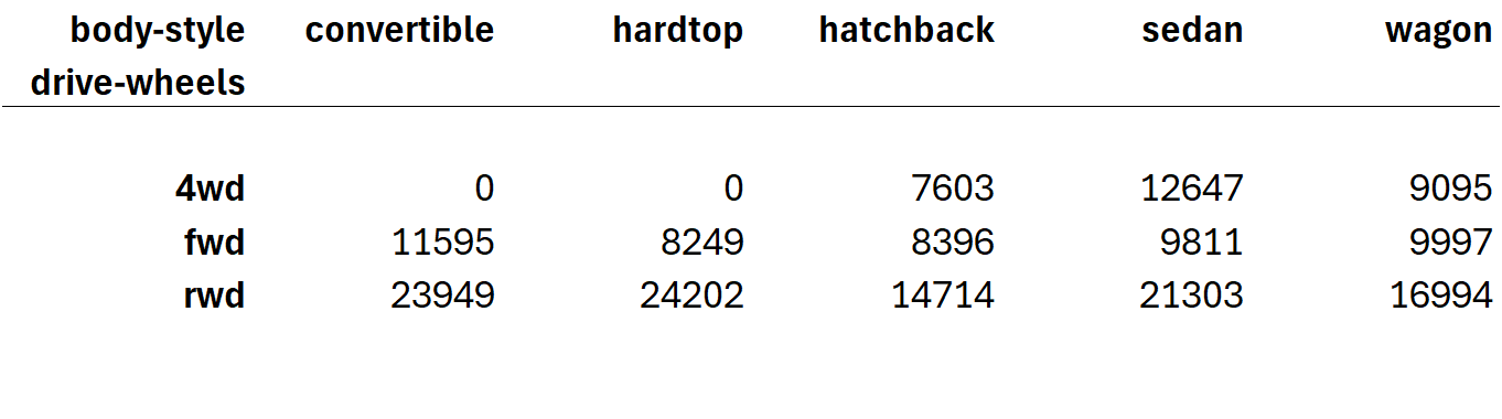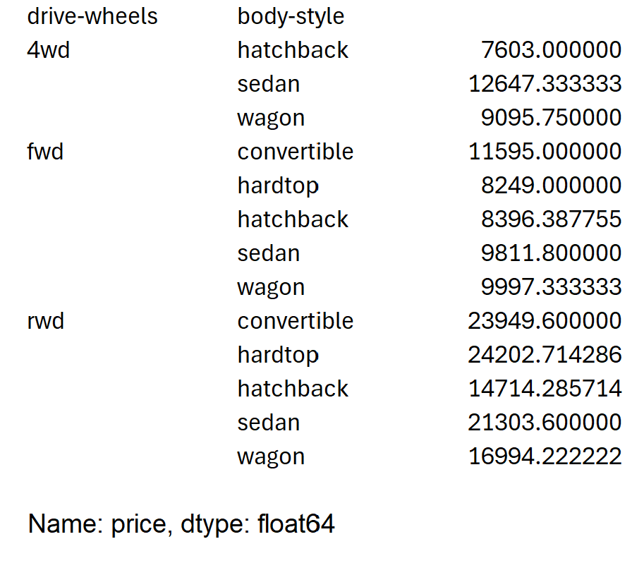 - # group "drive-wheels" and "body-style" and find the average price for each group in a pivot table: