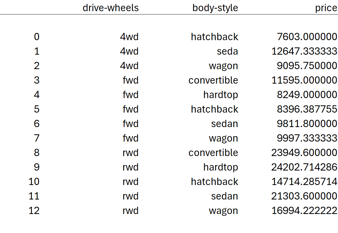 - group "drive-wheels" and "body-style" and find the average price for each group: