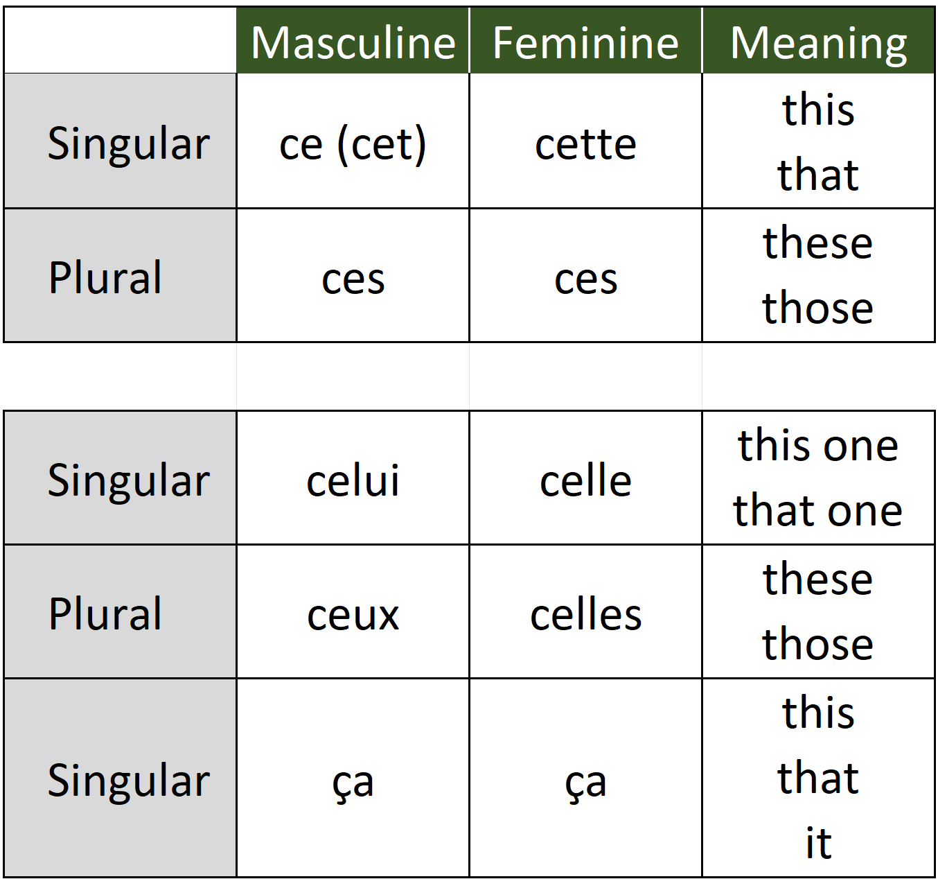 | ce m, cet m (in front of vowels and most words beginning with "h") | this / that |